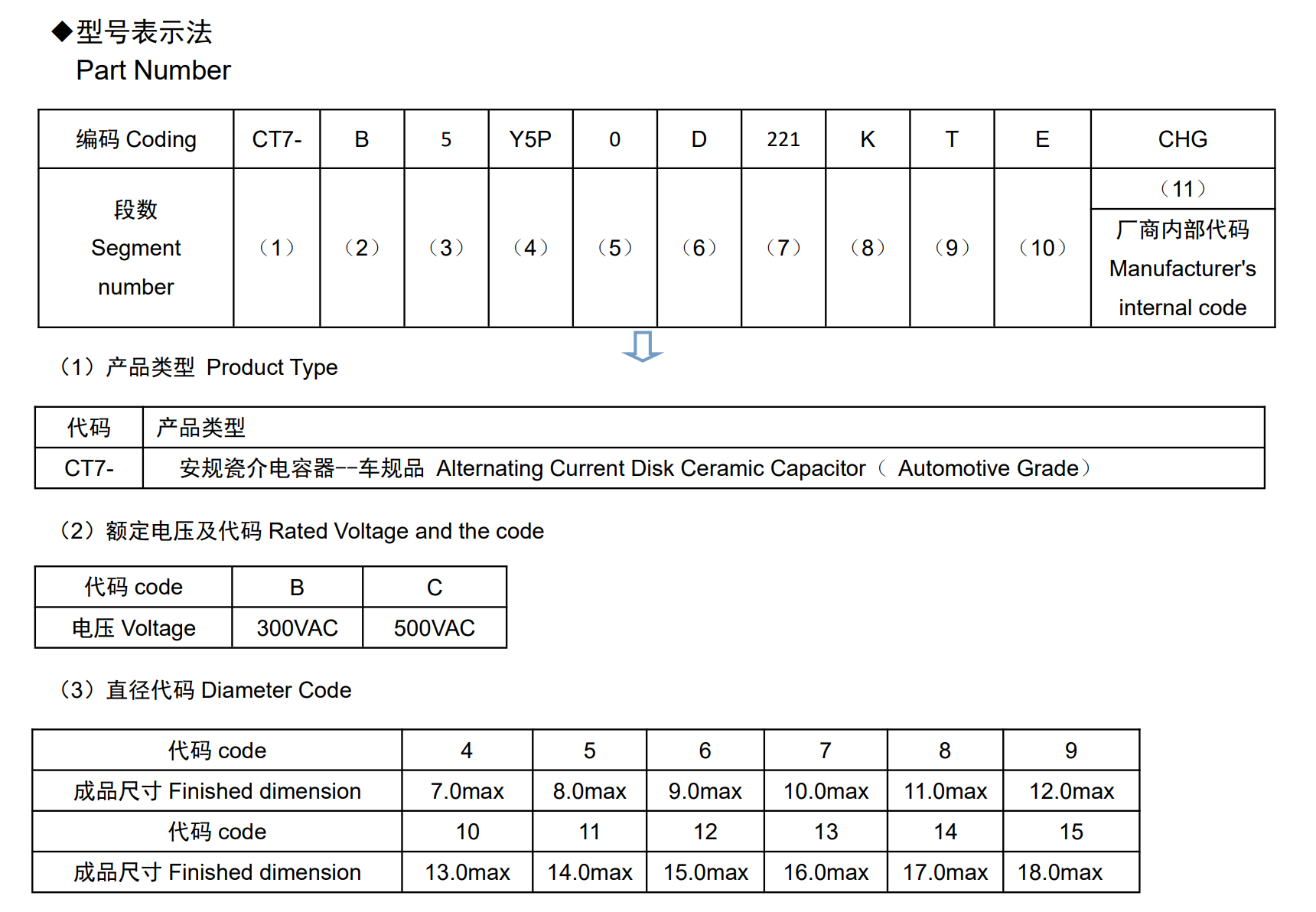 ■CT7 系列安规瓷介电容器--车规品◆特征* 符合 GB/T 6346.14-2015/IEC 60384.14-2005 及 AEC-Q200 REV D 认证标准。* 优异的耐振动性能,满足标准 MIL-STD-202 Method 204、AEC-Q200。* 优异的快速温变性能,满足 JESD22 Method JA-104、AEC-Q200。◆应用* 适于在电子设备中作为跨电源线连接、天线耦合、旁路、滤波等。