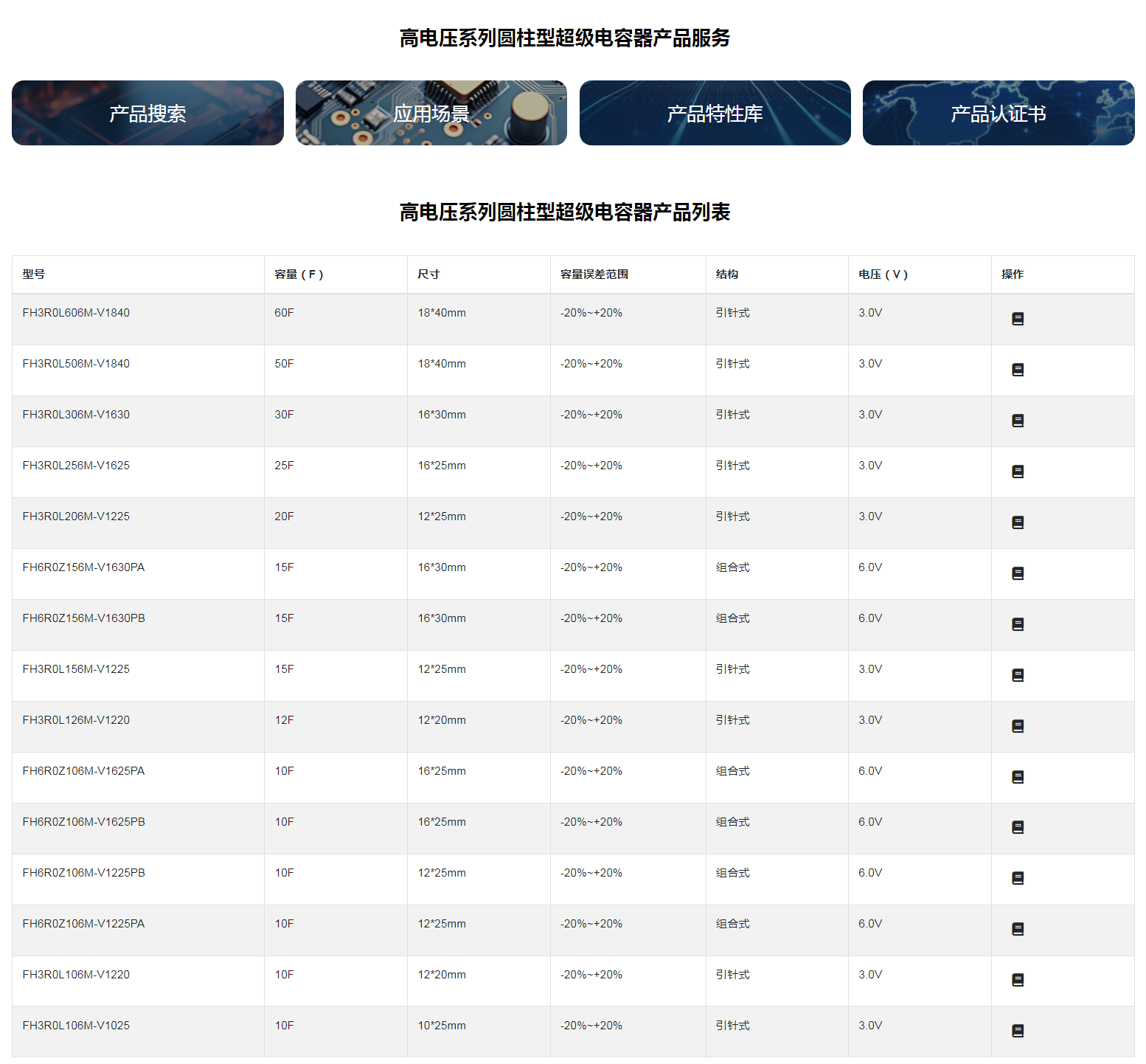 ■高电压系列圆柱型超级电容器◆特征* 内阻低,功率密度高* 自放电率小,72 小时自放电<20%*优异的循环寿命,库仑效率达 95%以上*工作温度范围宽;*绿色环保,满足 RoHs 要求◆应用* 智能仪表、行车记录仪、照明灯具、智能家居、工业控制;* 税控收款机、数码相机、电动工具、电动玩具、备用电源;*无线节能鼠标、无线手