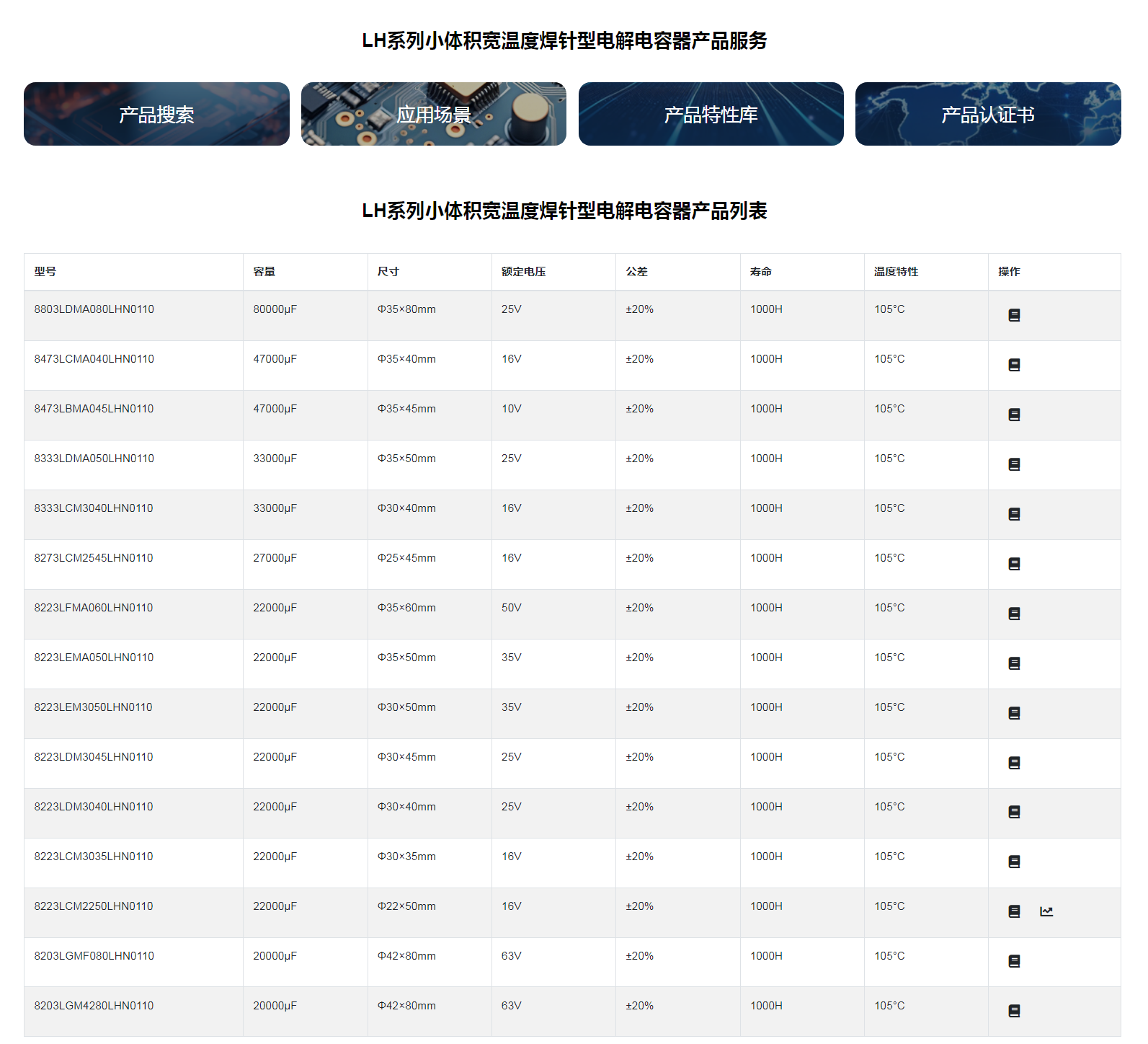 ■LH系列小体积宽温度焊针型电解电容器◆特征* 寿命: 105℃ 1000 小时* 小型化;* 符合 RoHS◆应用:* 适用于开关电源 、通信设备及其它各种电子产品。