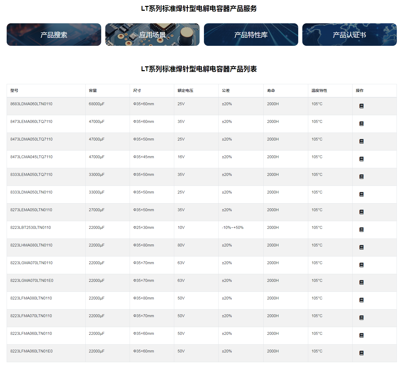 ■LT系列标准焊针型电解电容器◆特征* 寿命: 105℃ 2000 小时* 宽温度范围* 符合 RoHS◆应用:* 适用于开关电源 、通信设备及其它各种电子产品。