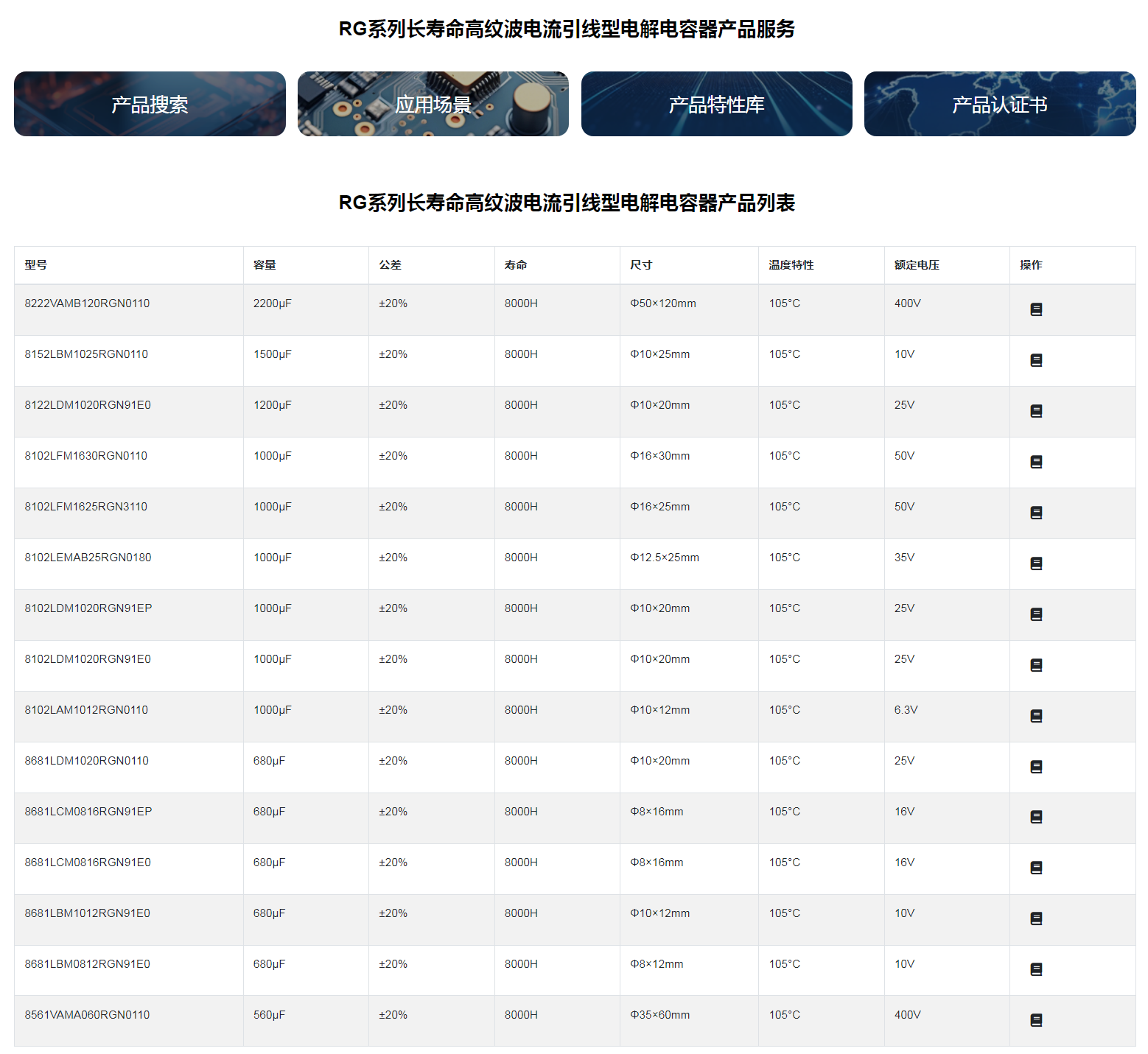 ■RG系列长寿命高纹波电流引线型电解电容器◆特征* 寿命: 105℃ 8000 小时* 长寿命* 符合 RoHS◆应用:* 适用于各类开关电源、LED驱动器等电子产品