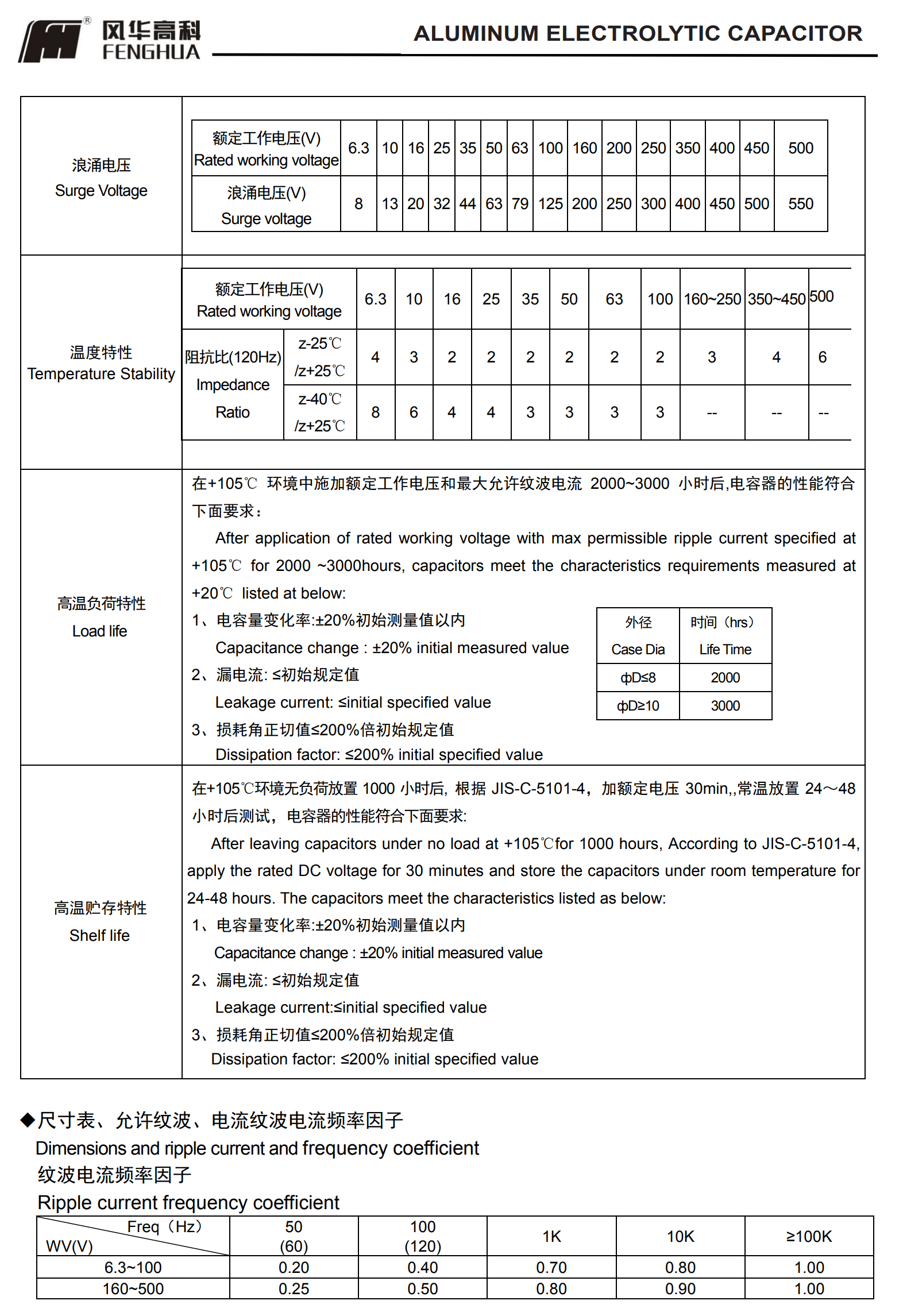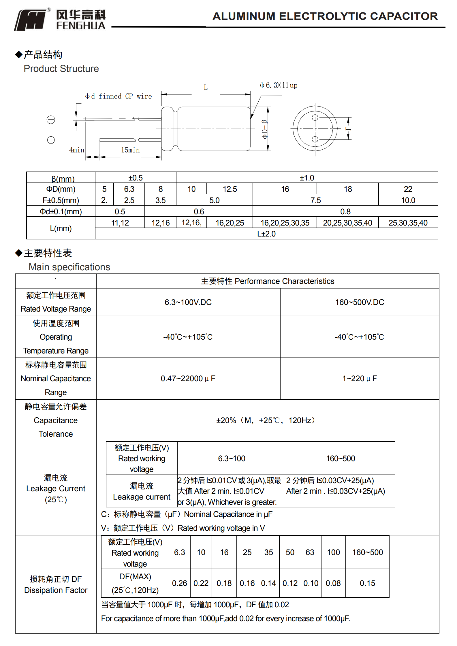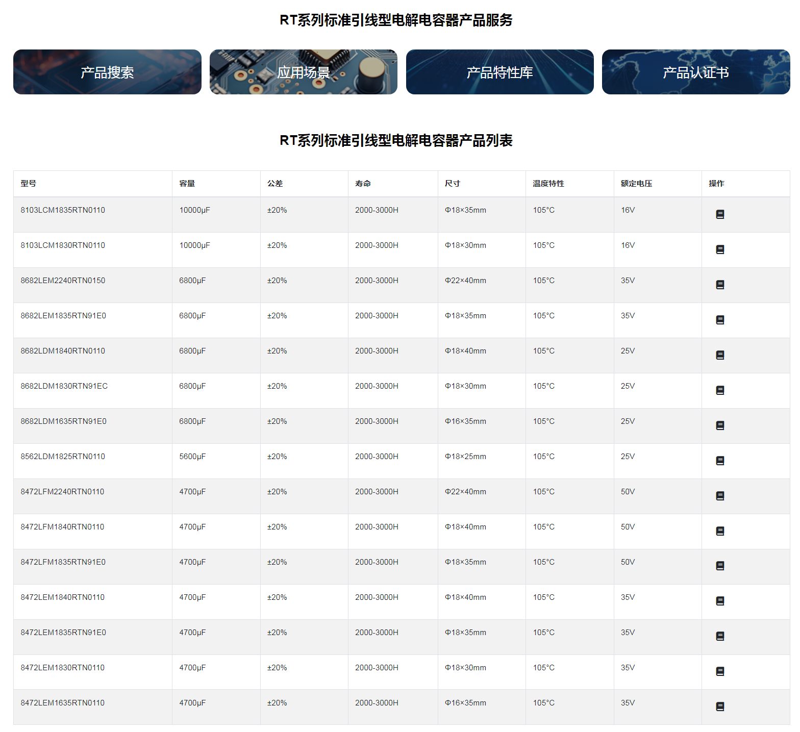 ■RT系列标准引线型电解电容器◆ 特征* 寿命: 105℃ 2000~3000 小时* 宽温度特性* 符合 RoHS◆应用* 适用于开关电源、通信设备及其他各种电子产品