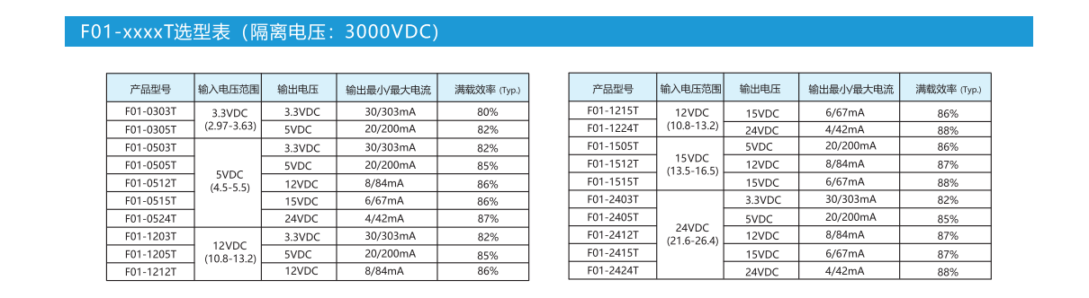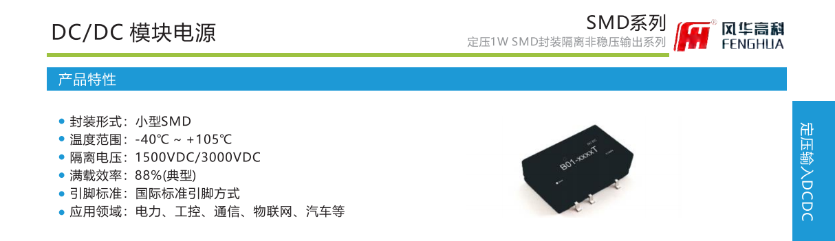 产品特性:封装形式:小型SMD温度范围:-40℃℃~+105°C隔离电压:1500VDC/3000VDC满载效率:88%(典型)引脚标准:国际标准引脚方式应用领域:电力、工控、通信、物联网、汽车等